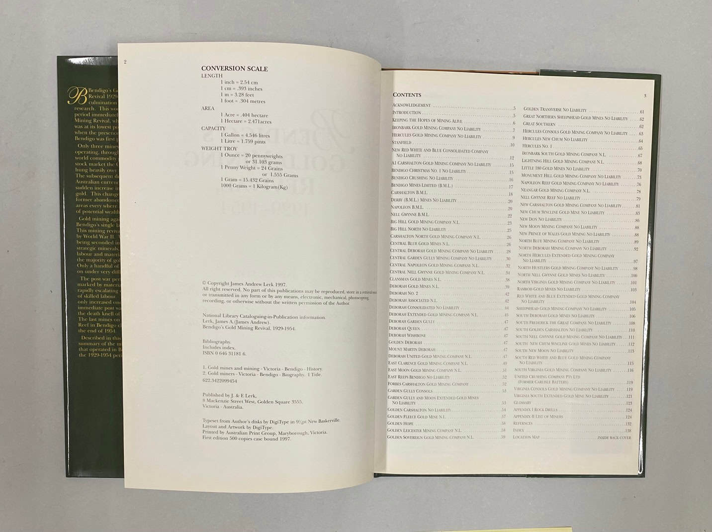 Only 500 of these 144-page books were printed, making it a scarce publication. It was the culmination of years of research by the author and has been printed on quality paper with a full-colour dust jacket with gold blocking. At the back of the book are a number of appendices, including a list of 3500 names of miners and the mines in which they worked. The text of the book is illustrated with more than 200 photographs, as well as drawings, maps and some technical descriptions. Please refer to all the photos provided and note the inscription by the author to the initial purchaser. Any questions? Please make contact prior to purchase.