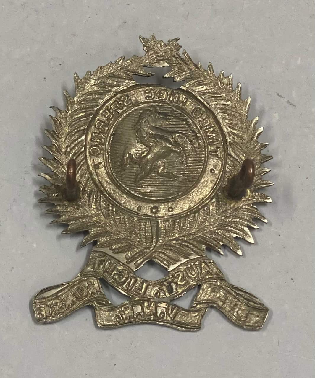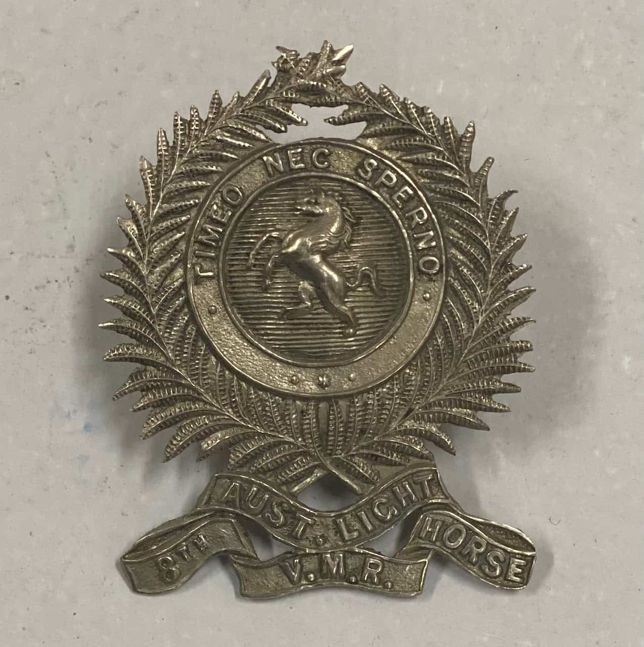 On offer is a scarce white metal hat badge from the 8th Australian Light Horse, Victorian Mounted Rifles (VMR), which was based in Victoria prior to WW1. The motto being ‘Timeo Nec Sperno’. Please refer to the photos provided as they are of the item you will receive. Both lugs are intact. Any questions? Please get in touch.