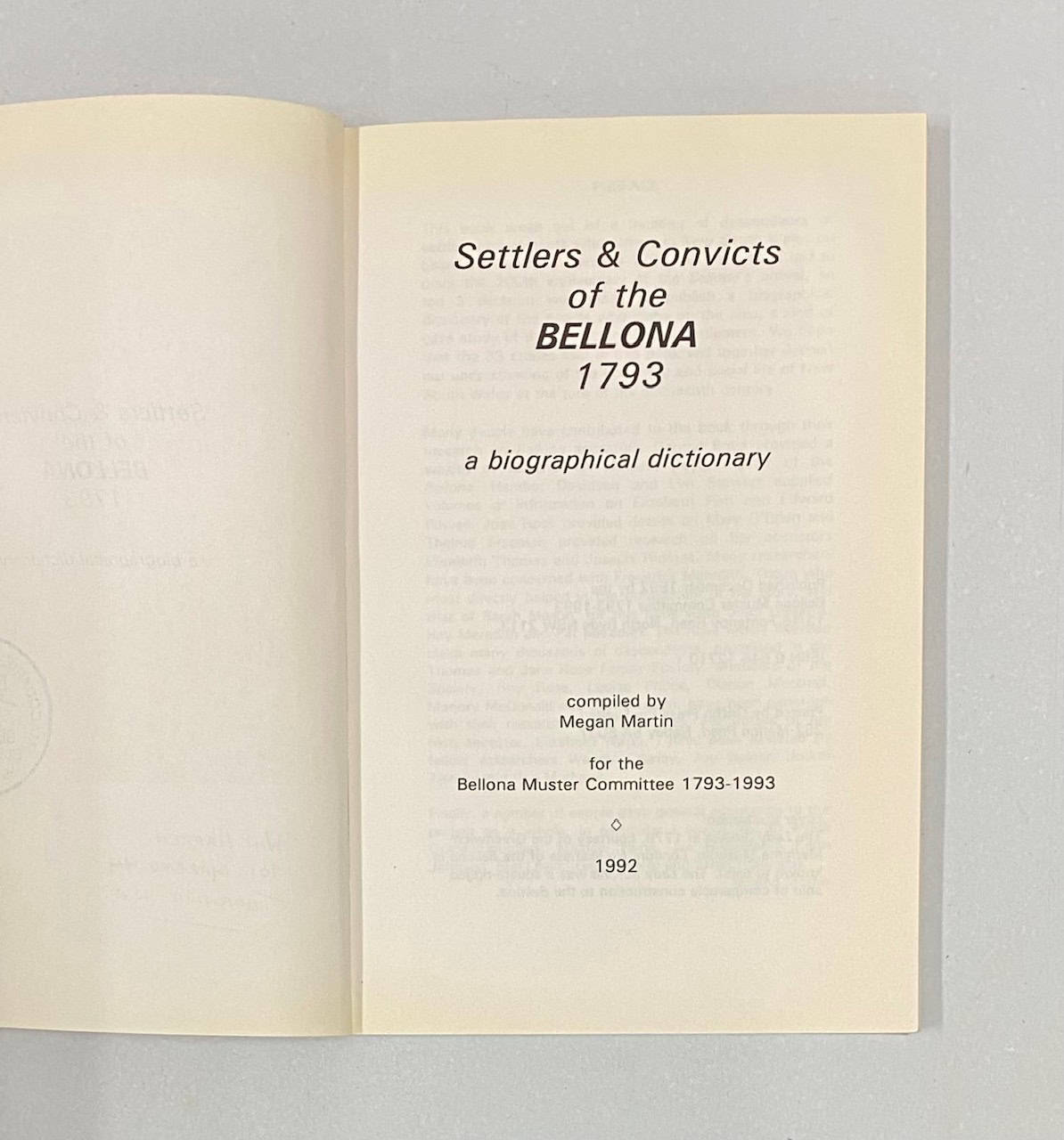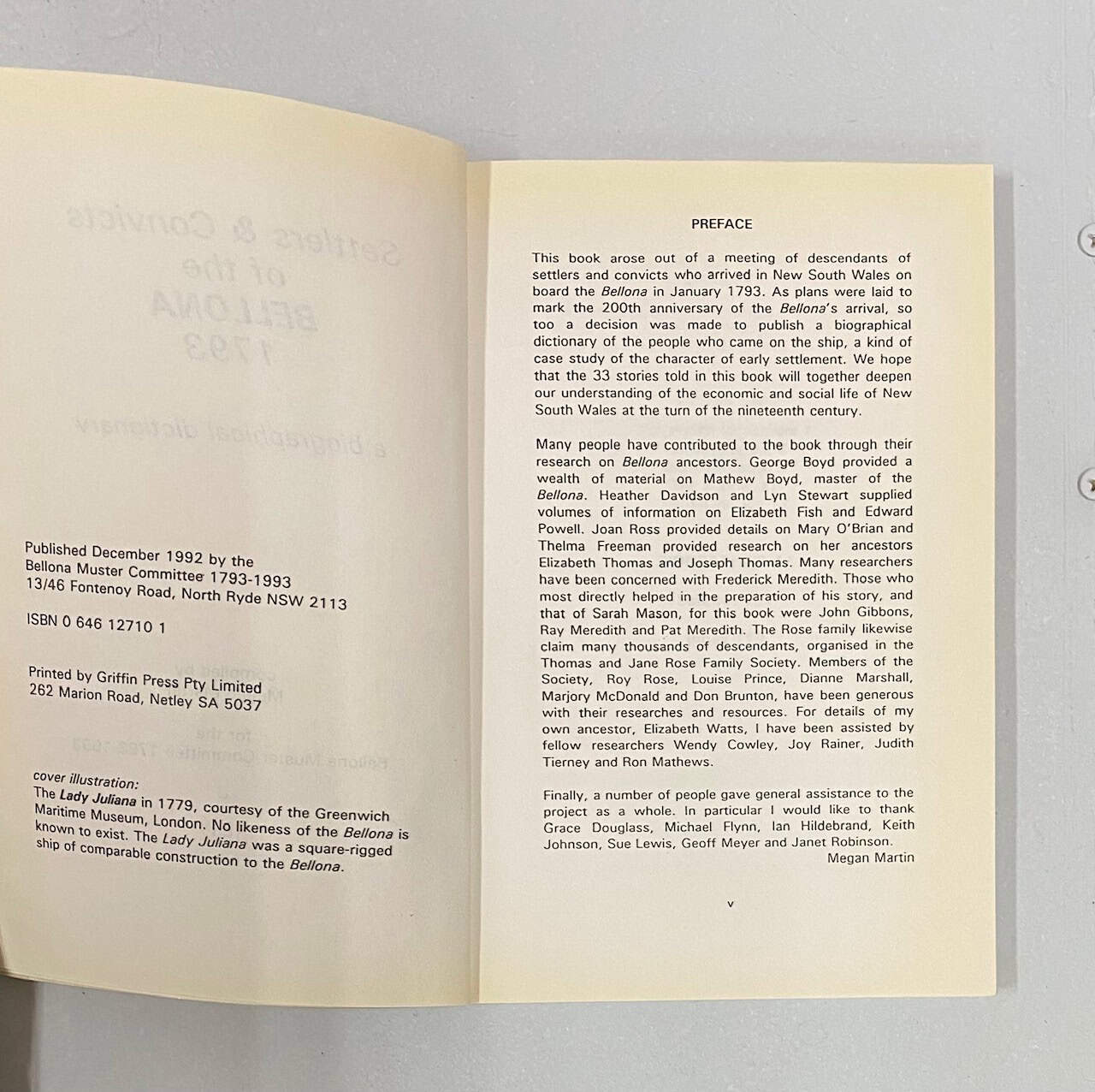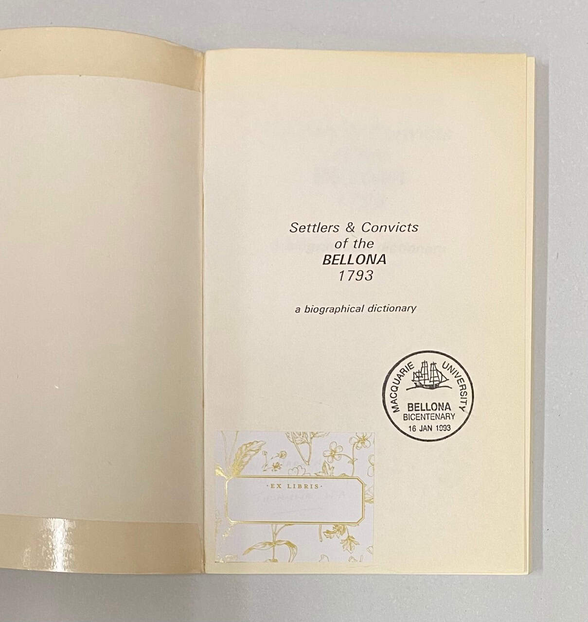 This is a scarce paperback book of 125 pages. The publication arose following a meeting of descendants of settlers and convicts who arrived in New South Wales aboard the Bellona in January 1793. A decision was then made to publish a biographical dictionary of the people who were aboard. The book has been covered in plastic which is not removeable. The book is in good condition but note the crease on the back cover. The crease goes through the back cover onto nearly half the pages. The creases could possibly be ironed out gently.
